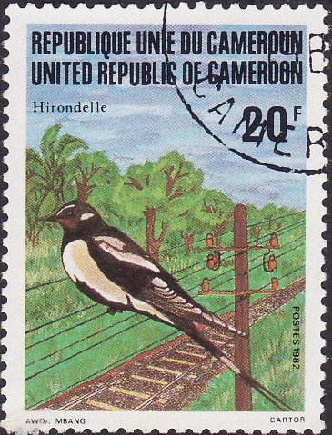 Visibility: public Image owner: none postage 8/10/1982 20fr multi dt=birds (1982 Cameroun) d=Hirundo rustica (1982 Cameroun) unwmk perf=12.75x13 Crops No visible images cropped from this one. Measurements Resolution is unknown. Source Source name: Colnect File URL: http://i.colnect.net/images/b/1979/467/Barn-Swallow-Hirundo-rustica.jpg Uploaded March 13, 2014, 3:46 am by Stan Shebs |