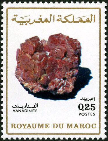 Visibility: public Image owner: none postage 4/30/1974 0,25(d) multi dt=Moroccan Mineral Sources d=Vanadinite (1974) unwmk perf=13.5x13 Crops No visible images cropped from this one. Measurements Resolution is unknown. Source Source name: Colnect File URL: http://i.colnect.net/b/1894/902/Vanadimite.jpg Uploaded March 27, 2014, 6:00 am by Stan Shebs |