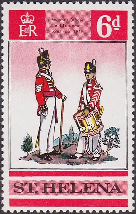 Visibility: public Image owner: none postage 9/3/1969 6p multi dt=uniforms (1969 St. Helena) d=Warrant Officer & Drummer wmk=mult crown & script CA Crops No visible images cropped from this one. Measurements Resolution is unknown. Source Source name: Colnect File URL: http://i.colnect.net/b/2003/473/WO-and-drummer-53rd-Foot-1815.jpg Uploaded April 4, 2014, 3:55 am by Stan Shebs |