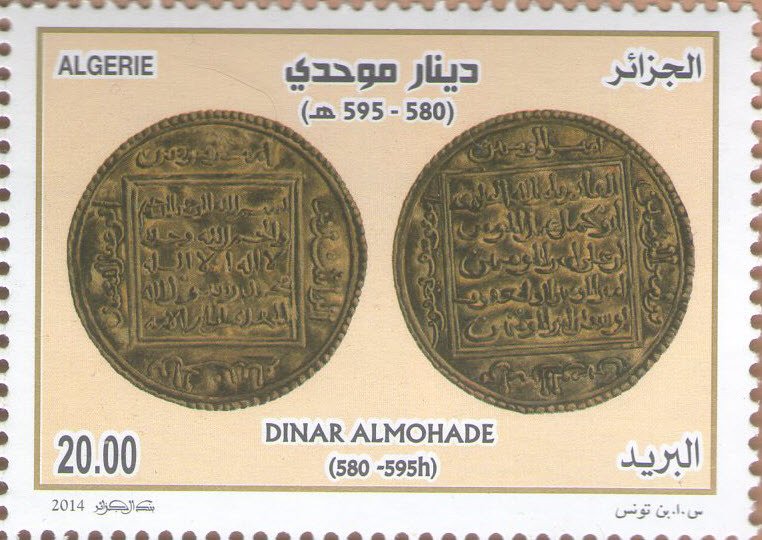 Visibility: public Image owner: none postage 2/26/2014 20.00d multi dt=Ancient Coins (2014) d=Almohad Dinar unwmk Crops No visible images cropped from this one. Measurements Resolution is unknown. Source Source name: Colnect File URL: http://i.colnect.net/b/2040/377/Almohade-s-Dinar-580-595-hijri.jpg Uploaded April 10, 2014, 2:21 pm by Stan Shebs |