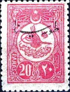 Visibility: public Image owner: none Current identification: postage 3/3/1916 20pa car issue=Sinai occupation d=tughra (1909) ovpt=Sinai occupation oc=blk on=1909-20pa-car unwmk Crops No visible images cropped from this one. Measurements Resolution is unknown. Source Source name: Colnect File URL: http://i.colnect.net/images/b/1419/318/overprint-on-post-stamps-of-1909.jpg Uploaded April 11, 2014, 3:36 pm by Stan Shebs |
