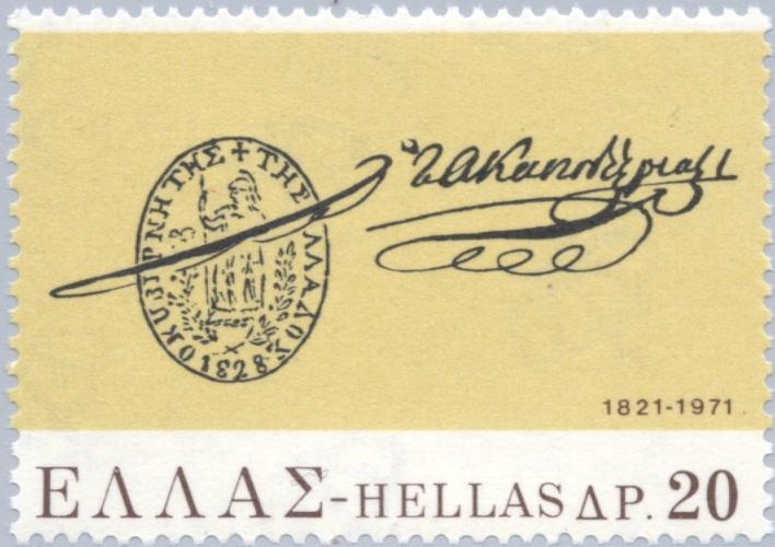 Visibility: public Image owner: none postage 2/8/1971 20d multi issue=uprising 150th wmk=crowns Crops No visible images cropped from this one. Measurements Resolution is unknown. Source Source name: Colnect File URL: http://i.colnect.net/b/172/295/1821-Revolution---Signature-and-Seal-of-IKapodistrias.jpg Uploaded August 21, 2014, 11:27 pm by Stan Shebs |