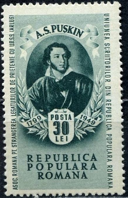 Visibility: public Image owner: none postage 5/20/1949 30l dkgrn issue=Pushkin 150th d=Alexander Pushkin (1949 Romania) wmk=RPR mult perf=14x14.5 Crops No visible images cropped from this one. Measurements Resolution is unknown. Source Source name: Colnect File URL: http://i.colnect.net/images/b/2087/018/Alexander-Pushkin.jpg Uploaded May 9, 2014, 8:39 pm by Stan Shebs |