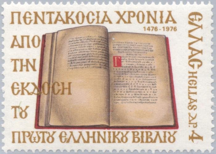 Visibility: public Image owner: none postage 12/8/1976 4d multi issue=1st printed Greek book 500th d=old Greek grammar book wmk=crowns perf=14x13 Crops No visible images cropped from this one. Measurements Resolution is unknown. Source Source name: Colnect File URL: http://i.colnect.net/b/173/525/500-years---First-Greek-book-Issued.jpg Uploaded August 21, 2014, 11:53 pm by Stan Shebs |