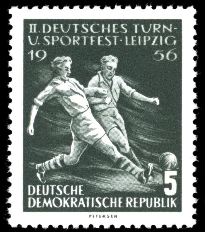 Visibility: public Image owner: none postage 7/25/1956 5pf dkgraygrn issue=2nd German Gymnastics & Sports Festival d=soccer players wmk=DDR & posthorn Crops No visible images cropped from this one. Measurements Resolution is unknown. Source Source name: Colnect File URL: http://i.colnect.net/images/b/1969/494/Football.jpg Uploaded May 22, 2014, 9:23 pm by Stan Shebs |