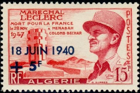 Visibility: public Image owner: none semipostal 7/1/1957 15fr+5fr car issue=17th Anniversary of General de Gaulle's Call to Arms d=++on=15fr unwmk Crops No visible images cropped from this one. Measurements Resolution is unknown. Source Source name: Colnect File URL: http://i.colnect.net/b/783/998/Marechal-Leclerc.jpg Uploaded August 22, 2014, 12:06 am by Stan Shebs |