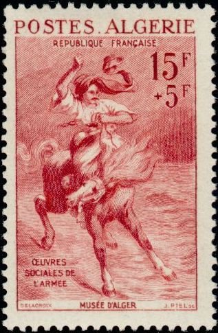 Visibility: public Image owner: none semipostal 12/1/1957 15+5fr red issue=Army Welfare Fund 1957 d="Horseman Crossing Ford", after Delacroix unwmk Crops No visible images cropped from this one. Measurements Resolution is unknown. Source Source name: Colnect File URL: http://i.colnect.net/b/783/999/Cavalier-passant-un-gué-par-Delacroix-Cavalier-from-a-ford-b.jpg Uploaded August 22, 2014, 12:06 am by Stan Shebs |