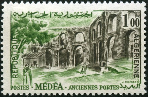 Visibility: public Image owner: none postage 11/1/1962 1fr grn&dkbrn dt=scenic (1962 Algeria) d=Medea gates unwmk Crops No visible images cropped from this one. Measurements Resolution is unknown. Source Source name: Colnect File URL: http://i.colnect.net/b/865/283/Médea.jpg Uploaded August 22, 2014, 12:06 am by Stan Shebs |