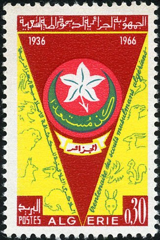 Visibility: public Image owner: none postage 7/23/1966 30c multi issue=Algerian Mohammedan Boy Scouts unwmk Crops No visible images cropped from this one. Measurements Resolution is unknown. Source Source name: Colnect File URL: http://i.colnect.net/b/887/567/Scout-flag.jpg Uploaded August 22, 2014, 1:33 am by Stan Shebs |