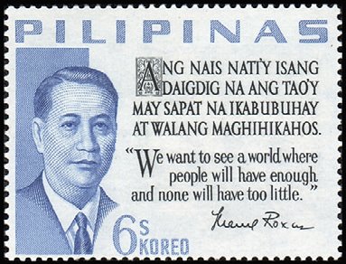 Visibility: public Image owner: none postage 6s issue=President Magsaysay quote unwmk perf=11 Crops No visible images cropped from this one. Measurements Resolution is unknown. Source Source name: Colnect File URL: http://i.colnect.net/b/2044/138/Presidential-Credo---Manuel-Roxas-1892-1948.jpg Uploaded May 29, 2014, 9:31 pm by Stan Shebs |