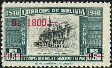 Visibility: public Image owner: none airmail 2/14/1957 1800b multi issue=1957 surcharges d=La Paz unwmk Crops No visible images cropped from this one. Measurements Resolution is unknown. Source Source name: Colnect File URL: http://i.colnect.net/images/b/555/516/La-Paz.jpg Uploaded August 22, 2014, 3:46 pm by Stan Shebs |