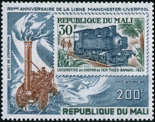Visibility: public Image owner: none airmail 2/25/1980 200fr multi issue=150th Anniversary of Liverpool and Manchester Railway d="Stephenson's "Rocket" (1829) unwmk perf=13 Crops No visible images cropped from this one. Measurements Resolution is unknown. Source Source name: Colnect File URL: http://i.colnect.net/b/2000/335/Locomotive--„Rocket“-and-Mali-Railway-stamp.jpg Uploaded July 1, 2014, 3:34 pm by Stan Shebs |