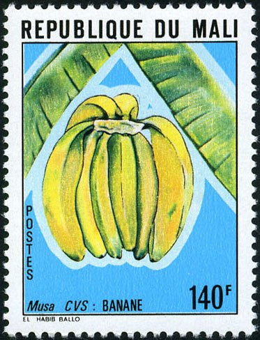 Visibility: public Image owner: none postage 6/9/1980 140fr multi dt=fruits (1980 Mali) d=Musa x paradisiaca (1980) unwmk perf=12.5x13 Crops No visible images cropped from this one. Measurements Resolution is unknown. Source Source name: Colnect File URL: http://i.colnect.net/b/2000/328/Bananas.jpg Uploaded July 1, 2014, 3:35 pm by Stan Shebs |