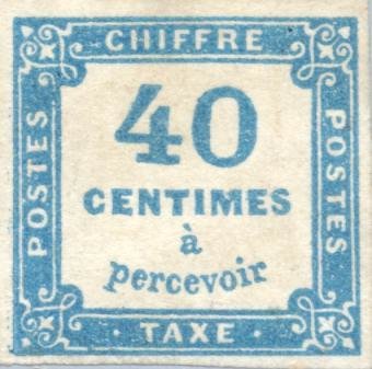 Visibility: public Image owner: none postage due 40c bl issue=1859 due d=numeral (1859 France) unwmk perf=13 Crops No visible images cropped from this one. Measurements Resolution is unknown. Source Source name: Colnect File URL: http://i.colnect.net/b/146/948/Tax--Chiffre-Taxe-.jpg Uploaded October 19, 2012, 5:22 pm by Stan Shebs |