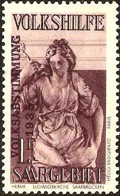 Visibility: public Image owner: none semipostal 12/1/1934 1+0.50fr issue=plebiscite 1935 d="Peace" Statue of Saint Louis church Saarbrücken ovpt=VOLKSABSTIMMUNG//1935 on=issue=1934 semi-1+0.50fr unwmk Crops No visible images cropped from this one. Measurements Resolution is unknown. Source Source name: Colnect File URL: http://i.colnect.net/b/1001/811/Plebiscite.jpg Uploaded August 22, 2014, 5:04 pm by Stan Shebs |