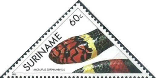 Visibility: public Image owner: none postage 11/14/1991 60c multi dt=snakes (1991 Surinam) d=Micrurus surinamensis (1991) unwmk perf=13.5 Crops No visible images cropped from this one. Measurements Resolution is unknown. Source Source name: Colnect File URL: http://i.colnect.net/b/2001/068/Aquatic-Coral-Snake-Micrurus-surinamensis.jpg Uploaded July 11, 2014, 8:36 pm by Stan Shebs |