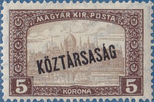 Visibility: public Image owner: none postage 11/1918 5k dkbrn<brn issue=1918a d=Hungarian Parliament Building (KIR POSTA) var=colored numerals ovpt=KOZTARSASAG oc=blk on=5k-Hungarian Parliament Building (KIR POSTA) wmk=double cross horiz Crops No visible images cropped from this one. Measurements Resolution is unknown. Source Source name: Colnect File URL: http://i.colnect.net/b/677/880/Parliament-building-with--Republic--overprint.jpg Uploaded August 22, 2014, 8:56 pm by Stan Shebs |