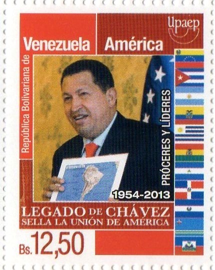 Visibility: public Image owner: none postage 3/2/2014 12.50b multi issue=America UPAEP 2014 unwmk Crops No visible images cropped from this one. Measurements Resolution is unknown. Source Source name: Colnect File URL: http://i.colnect.net/b/2282/638/Hugo-Chávez.jpg Uploaded October 26, 2014, 7:14 pm by Stan Shebs |