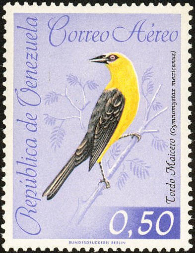 Visibility: public Image owner: none airmail 12/14/1962 0.50b multi dt=birds (1962 Venezuela) d=Gymnomystax mexicanus unwmk perf=14x13.5 Crops No visible images cropped from this one. Measurements Resolution is unknown. Source Source name: Colnect File URL: http://i.colnect.net/b/2287/723/Oriole-Blackbird-Gymnomystax-mexicanus.jpg Uploaded October 26, 2014, 8:08 pm by Stan Shebs |
