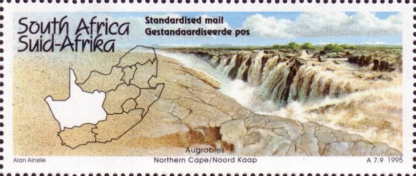 Visibility: public Image owner: none postage 6/30/1995 60c multi issue=Tourism 1995 d=Augrabies Falls Northern Cape Province unwmk Crops No visible images cropped from this one. Measurements Resolution is unknown. Source Source name: Colnect File URL: http://i.colnect.net/b/2187/537/Augrabies-Falls-Northern-Cape-Province.jpg Uploaded October 26, 2014, 11:16 pm by Stan Shebs |