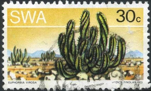Visibility: public Image owner: none postage 9/1/1973 30c dt=succulent plants (1973) d=Euphorbia virosa wmk=RSA in triangle Crops No visible images cropped from this one. Measurements Resolution is unknown. Source Source name: Colnect File URL: http://i.colnect.net/b/2310/164/Euphorbia-virosa.jpg Uploaded October 27, 2014, 3:58 pm by Stan Shebs |