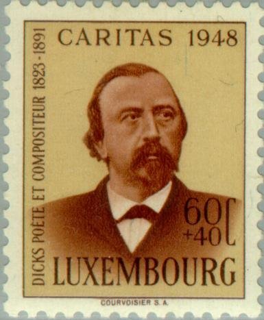 Visibility: public Image owner: none semipostal 11/18/1948 60c+40c ltbrn&yel issue=Caritas 1948 d=Dicks Edmond de la Fontaine poet & composer unwmk perf=11.5 Crops No visible images cropped from this one. Measurements Resolution is unknown. Source Source name: Colnect File URL: http://i.colnect.net/b/133/741/Dicks-Edmond-de-la-Fontaine-poet-and-composer.jpg Uploaded August 22, 2014, 9:55 pm by Stan Shebs |