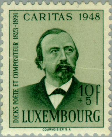 Visibility: public Image owner: none semipostal 11/18/1948 10+5fr grn&graygrn issue=Caritas 1948 d=Dicks Edmond de la Fontaine poet & composer unwmk perf=11.5 Crops No visible images cropped from this one. Measurements Resolution is unknown. Source Source name: Colnect File URL: http://i.colnect.net/b/133/744/Dicks-Edmond-de-la-Fontaine-poet-and-composer.jpg Uploaded August 22, 2014, 9:55 pm by Stan Shebs |