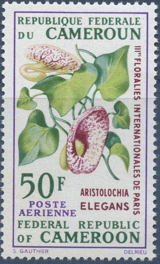 Visibility: public Image owner: none airmail 5/14/1969 50fr multi issue=Flower Exhibition d=Aristolochia elegans unwmk Crops No visible images cropped from this one. Measurements Resolution is unknown. Source Source name: Colnect File URL: http://i.colnect.net/b/2154/393/Aristolochia-elegans.jpg Uploaded November 21, 2014, 1:04 am by Stan Shebs |