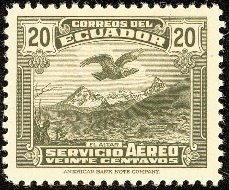 Visibility: public Image owner: none airmail 20c issue=1937 air unwmk perf=12 Crops No visible images cropped from this one. Measurements Resolution is unknown. Source Source name: Colnect File URL: http://i.colnect.net/b/2288/941/Andean-Condor-Vultur-gryphus-over-El-Altar.jpg Uploaded November 25, 2014, 10:55 pm by Stan Shebs |