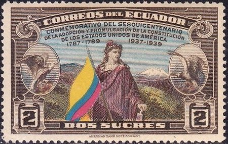Visibility: public Image owner: none postage 2/22/1938 2s blkbrn&multi issue=US Constitution 150th d=Liberty carrying flag of Ecuador unwmk perf=12 Crops No visible images cropped from this one. Measurements Resolution is unknown. Source Source name: Colnect File URL: http://i.colnect.net/images/b/2289/227/-quot-Liberty-quot--carrying-flag-of-Ecuador.jpg Uploaded November 25, 2014, 10:56 pm by Stan Shebs |