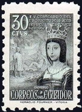 Visibility: public Image owner: none postage 4/22/1954 30c issue=Isabella 500th d=Queen Isabella I of Spain unwmk perf=12 Crops No visible images cropped from this one. Measurements Resolution is unknown. Source Source name: Colnect File URL: http://i.colnect.net/images/b/2343/816/Queen-Isabella-I-of-Spain.jpg Uploaded November 26, 2014, 1:19 am by Stan Shebs |