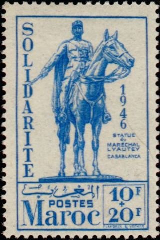 Visibility: public Image owner: none semipostal 12/16/1946 10+20fr bl issue=Marshal Lyautey unwmk Crops No visible images cropped from this one. Measurements Resolution is unknown. Source Source name: Colnect File URL: http://i.colnect.net/b/848/628/Equestrian-statue-of-Lyautey-in-Casablanca.jpg Uploaded August 22, 2014, 10:55 pm by Stan Shebs |