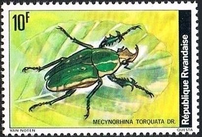 Visibility: public Image owner: none postage 5/22/1978 10fr multi dt=beetles (1978 Rwanda) d=Mecynorhina torquata unwmk Crops No visible images cropped from this one. Measurements Resolution is unknown. Source Source name: Colnect File URL: http://i.colnect.net/b/2396/414/Flower-Chafer-Mecynorhina-torquata.jpg Uploaded December 22, 2014, 5:53 pm by Stan Shebs |