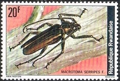 Visibility: public Image owner: none postage 5/22/1978 20fr multi dt=beetles (1978 Rwanda) d=Macrotoma serripes unwmk Crops No visible images cropped from this one. Measurements Resolution is unknown. Source Source name: Colnect File URL: http://i.colnect.net/b/2396/416/Longhorn-Beetle-Macrotoma-serripes.jpg Uploaded December 22, 2014, 5:53 pm by Stan Shebs |