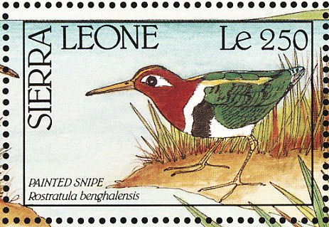 Visibility: public Image owner: none postage 6/4/1990 250le multi dt=birds (1990 Sierra Leone) d=greater painted-snipe Rostratula benghalensis unwmk perf=14 Crops No visible images cropped from this one. Measurements Resolution is unknown. Source Source name: Colnect File URL: http://i.colnect.net/images/b/2194/118/Greater-Painted-snipe-Rostratula-benghalensis.jpg Uploaded December 23, 2014, 4:44 pm by Stan Shebs |