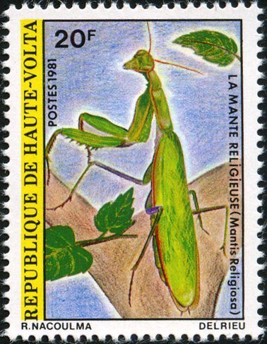 Visibility: public Image owner: none postage 3/10/1981 20fr multi dt=insects (1981 Upper Volta) d=Mantis religiosa (1981) unwmk Crops No visible images cropped from this one. Measurements Resolution is unknown. Source Source name: Colnect File URL: http://i.colnect.net/b/2244/839/Praying-Mantis-Mantis-religiosa.jpg Uploaded December 27, 2014, 6:29 pm by Stan Shebs |