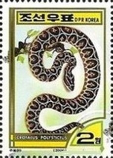Visibility: public Image owner: none postage 2/10/2000 2w multi issue=Animals of the World - Snakes d=Crotalus polystictus unwmk perf=13.25 Crops No visible images cropped from this one. Measurements Resolution is unknown. Source Source name: Colnect File URL: http://i.colnect.net/b/2262/829/Mexican-Lance-headed-Rattlesnake-Crotalus-polystictus.jpg Uploaded January 8, 2015, 4:43 pm by Stan Shebs |