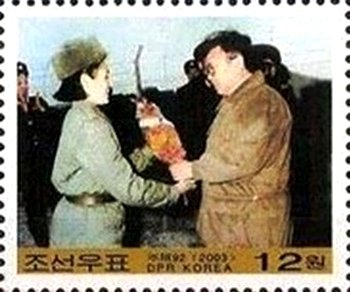 Visibility: public Image owner: none Crops No visible images cropped from this one. Measurements Resolution is unknown. Source Source name: Colnect File URL: http://i.colnect.net/images/b/2412/456/Kim-Jong-Il-receiving-bouquet-from-female-soldier.jpg Uploaded January 8, 2015, 5:07 pm by Stan Shebs |