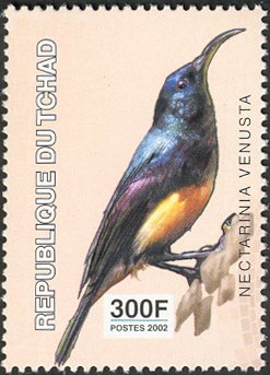 Visibility: public Image owner: none postage 6/2/2003 300fr multi dt=flora & fauna (2003 Chad) d=Nectarinia venusta (2003) unwmk Crops No visible images cropped from this one. Measurements Resolution is unknown. Source Source name: Colnect File URL: http://i.colnect.net/b/2395/310/Yellow-bellied-Sunbird-Nectarina-venusta.jpg Uploaded January 31, 2015, 5:16 pm by Stan Shebs |