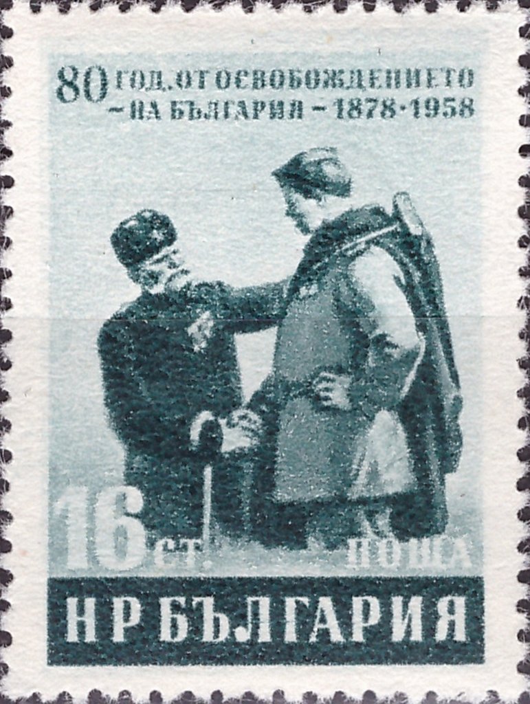 Visibility: public Image owner: none postage 8/13/1957 16s dkblgrn issue=liberation from Turks 80th d=Bulgarian veteran & Russian soldier unwmk perf=13 Crops No visible images cropped from this one. Measurements Resolution is unknown. Source Source name: Colnect File URL: http://i.colnect.net/images/b/2381/286/Old-Defender-of-the-Shipka-Pass-and-young-Soviet-Soldier.jpg Uploaded February 5, 2015, 5:02 am by Stan Shebs |
