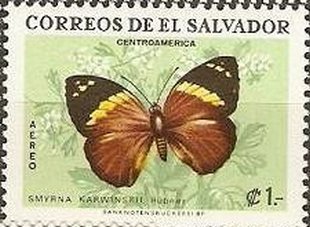 Visibility: public Image owner: none airmail 6/13/1969 1col multi dt=butterflies (1969 El Salvador) d=Smyrna karwinskii unwmk Crops No visible images cropped from this one. Measurements Resolution is unknown. Source Source name: Colnect File URL: http://i.colnect.net/b/2336/442/Karwinski-s-Beauty-Smyrna-karwinskii.jpg Uploaded February 17, 2015, 12:19 am by Stan Shebs |