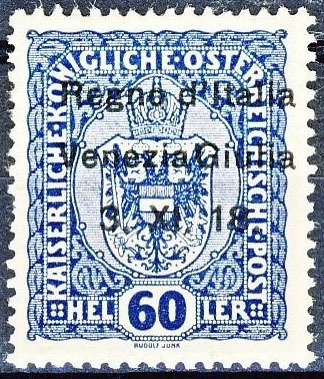 Visibility: public Image owner: none postage 60h dpbl issue=1918a d=arms of Austria (1916 a) ovpt=Regno d'Italia//Venezia Giulia//3. XI. 18. oc=blk on=issuer=Austria-1916-60h-dpbl unwmk perf=12.5 Crops No visible images cropped from this one. Measurements Resolution is unknown. Source Source name: Colnect File URL: http://i.colnect.net/b/1698/367/Italian-Occupation-of-Veneto-Giulia.jpg Uploaded February 18, 2015, 5:49 am by Stan Shebs |