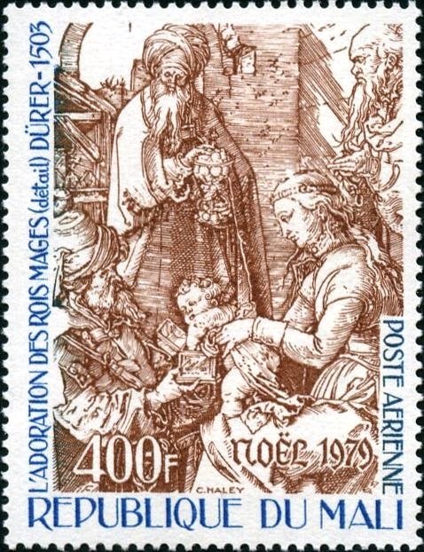 Visibility: public Image owner: none airmail 12/10/1979 400fr brn&bl issue=Christmas 1979 d="The Adoration of the Magi" - Durer unwmk perf=13 Crops No visible images cropped from this one. Measurements Resolution is unknown. Source Source name: Colnect File URL: http://i.colnect.net/images/b/2503/851/The-Adoration-of-the-Magi-1511-detail.jpg Uploaded February 18, 2015, 5:45 pm by Stan Shebs |