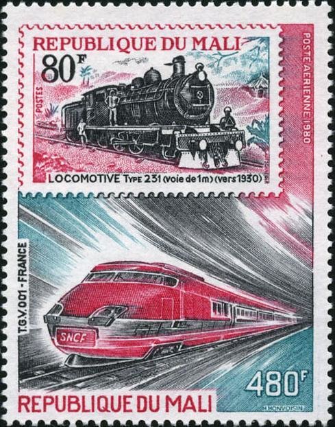 Visibility: public Image owner: none airmail 11/17/1980 480fr multi dt=Locomotives (1980 Mali) d=TGV 001 Turbotrain, France unwmk perf=13 Crops No visible images cropped from this one. Measurements Resolution is unknown. Source Source name: Colnect File URL: http://i.colnect.net/b/2508/635/TGV-001-France-and-Mali-stamp-of-1970.jpg Uploaded February 18, 2015, 5:48 pm by Stan Shebs |