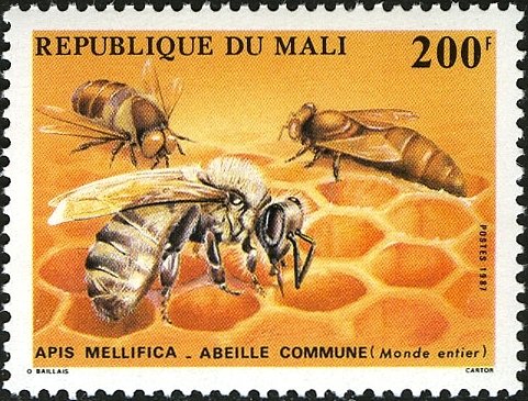Visibility: public Image owner: none postage 5/11/1987 200fr multi dt=bees (1987 Mali) d=Apis mellifera (1987) unwmk perf=13.5 Crops No visible images cropped from this one. Measurements Resolution is unknown. Source Source name: Colnect File URL: http://i.colnect.net/b/2273/540/Honey-Bee-Apis-mellifica.jpg Uploaded February 18, 2015, 5:54 pm by Stan Shebs |