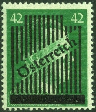 Visibility: public Image owner: none postage 6/21/1945 42pf brtgrn issue=1945 overprints d=Hitler head Grossdeutsches Reich ovpt=vert bars(Oesterreich) oc=blk on=issuer=Germany-42pf unwmk perf=14 Crops No visible images cropped from this one. Measurements Resolution is unknown. Source Source name: Colnect File URL: http://i.colnect.net/b/2389/097/Overprint-German-stamp-Hitler.jpg Uploaded March 18, 2015, 12:38 am by Stan Shebs |
