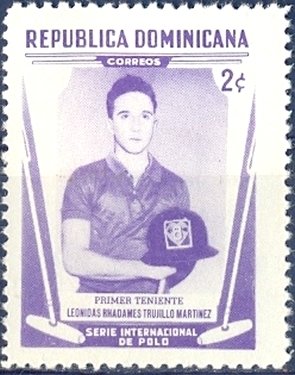 Visibility: public Image owner: none postage 5/15/1959 2c pur issue=Jamaica-Dominican Republic polo match d=Leonidas Trujillo unwmk perf=12.5 Crops No visible images cropped from this one. Measurements Resolution is unknown. Source Source name: Colnect File URL: http://i.colnect.net/b/2390/892/Lieutenant-Leonidas-Trujillo-Rhadames-Martínez-1943-to-1995.jpg Uploaded April 27, 2015, 3:10 am by Stan Shebs |