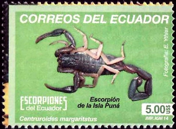 Visibility: public Image owner: none postage 9/30/2014 $5.00 multi issue=Ecuador Scorpions dt=Ecuador Scorpions unwmk Crops No visible images cropped from this one. Measurements Resolution is unknown. Source Source name: Colnect File URL: http://i.colnect.net/images/b/2607/863/Bark-Scorpion-Centruroides-margaritatus.jpg Uploaded May 11, 2015, 3:20 am by Stan Shebs |