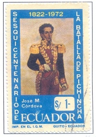 Visibility: public Image owner: none postage 5/24/1972 1s multi issue=150th Anniversary of Battle of Pichincha d=Jos M. Cordova unwmk Crops No visible images cropped from this one. Measurements Resolution is unknown. Source Source name: Colnect File URL: http://i.colnect.net/b/2543/230/Jose-M-Cordova.jpg Uploaded May 11, 2015, 4:01 am by Stan Shebs |