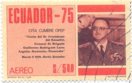 Visibility: public Image owner: none airmail 3/18/1975 5.00s multi issue=State Visits of President Rodriguez Lara to Algeria, Rumania and Venezuela d=President Rodriguez Lara unwmk Crops No visible images cropped from this one. Measurements Resolution is unknown. Source Source name: Colnect File URL: http://i.colnect.net/images/b/2543/256/Brigadier-General-Guillermo-Rodr-iacute-guez-President.jpg Uploaded May 11, 2015, 4:18 am by Stan Shebs |